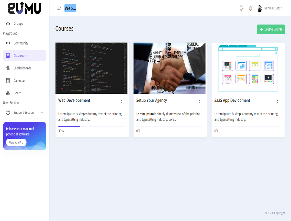 With the Classroom feature, you can share your skills and knowledge through captivating courses. Craft engaging lessons, upload multimedia resources, and track learner progress.
